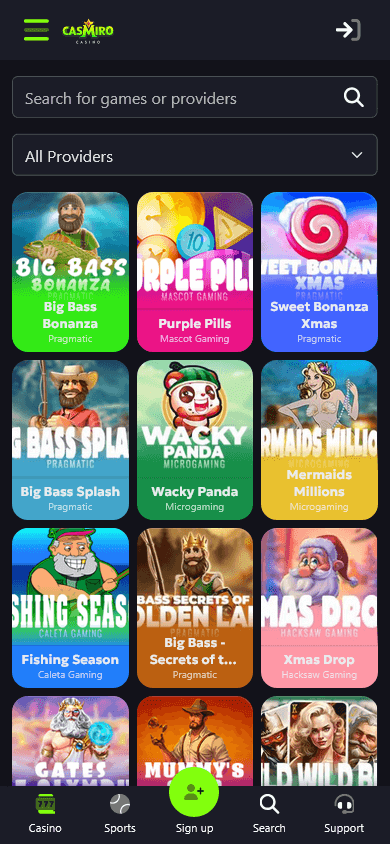 Однозначная рекомендация: рассматривать Casmiro стоит только игрокам, которых интересует разнообразие слотов и настольных игр, готовым принять отсутствие прозрачности. На площадке представлено около 15 поставщиков, в числе которых Pragmatic Play, Yggdrasil Gaming, Amatic, BGaming, Wazdan и ряд других, а также доступна удобная поддержка множества популярных депозитных методов, включая банковские карты, электронные кошельки и криптовалюты. Казино ориентируется на международных пользователей и не ограничивает регистрацию для большинства стран.