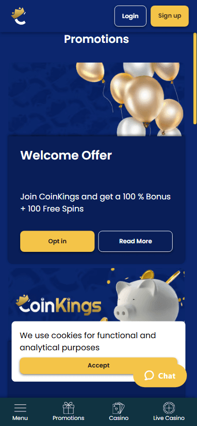 Основные преимущества CoinKings – чистый, интуитивный интерфейс, грамотная организация навигации и отсутствие спама бонусами. Для новых и постоянных клиентов предусмотрены лаконичные предложения с бонусом на депозит, но без агрессивного промо. Платежная система максимально гибкая: поддерживается 20 криптовалют, включая Bitcoin, Ethereum, Tether, Solana, Polygon, Shiba Inu и другие альткойны. С другой стороны, нельзя вывести средства на банковский счет или электронный кошелек – только в криптовалюте, что ограничивает аудиторию.