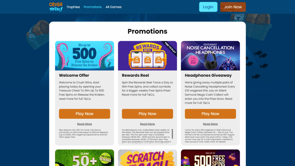 Crush Wins Casino подходит тем, кто ищет лицензионное казино с надежной защитой, быстрыми выплатами и разнообразными бонусами. Это популярная платформа для игроков в Великобритании, предлагающая гибкие способы оплаты и обширную линейку развлечений, но не лучший выбор для любителей большого выбора настольных игр или моментальной поддержки через live-чат.