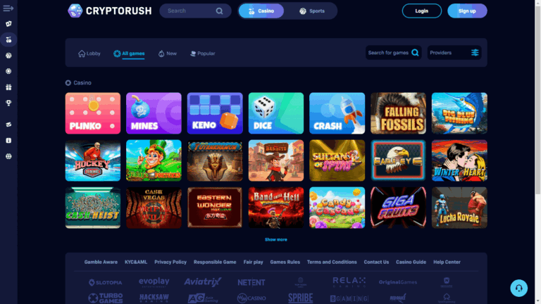 CryptoRush предлагает внушительный выбор – около 45 игровых провайдеров, в числе которых NetEnt, Nolimit City, Evolution Gaming, Pragmatic Play, Play’n GO, Yggdrasil и многие другие. В наличии видеослоты, рулетка, блэкджек, бинго, live-казино, кено, скретч-карты, виртуальный спорт, crash-игры и эксклюзивные оригинальные разработки. Каталог обновляется новинками, а также доступны турниры и лотереи. Сайт предоставляет демо-режим, а для активных клиентов предусмотрены программа лояльности, ежедневные призы, reload-бонусы и возвраты средств на live-играх.