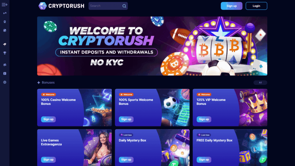 CryptoRush – онлайн-казино с акцентом на криптовалютные платежи и широким выбором игр ведущих провайдеров, совмещающее богатую игровую библиотеку и поддержку ставок на спорт, но не отличающееся высоким уровнем безопасности выплат и надежности.