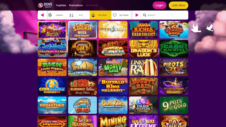 Dove Slots Casino отличается значительным выбором игровых автоматов, настольных игр и большими возможностями в разделе live-игр. Платформа работает на основе лицензий Alderney Gambling Control Commission и UK Gambling Commission, что подтверждает высокий уровень доверия и прозрачности политики. Компания предоставляет более 94 поставщиков программного обеспечения – в числе партнеров лидеры индустрии, такие как NetEnt, Microgaming, Yggdrasil, Evolution и Pragmatic Play. Ассортимент позволяет найти актуальные слоты, популярные новинки и классические автоматы с удобной фильтрацией по алфавиту или поисковой строке, которая заменяет стандартные фильтры по провайдерам.