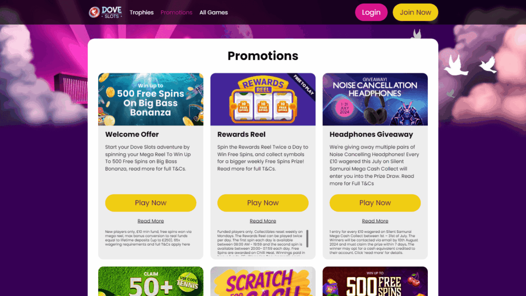 Бонусная политика состоит из двух предложений, актуальные условия которых всегда доступны в специальном разделе сайта. Для резидентов Великобритании, Олдерни и Нормандских островов наибольшая часть функционала полностью раскрыта, однако действуют территориальные ограничения для других регионов. Dove Slots Casino заслуживает внимания игроков, ищущих надежную и понятную площадку с доказанной безопасностью и разветвленным ассортиментом развлечений.
