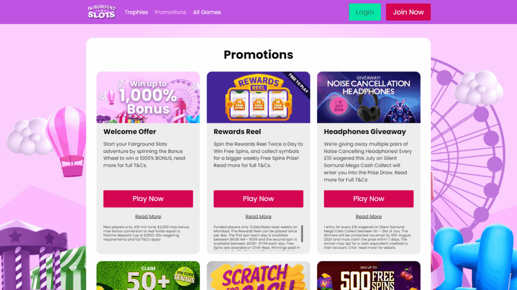 Fairground Slots подойдет игрокам, ищущим прозрачные условия, крупные выплаты без лимитов и разнообразный контент. Регистрация не вызывает затруднений, интерфейс интуитивно понятен, а гибкая бонусная система поддерживает интерес к платформе на длительном отрезке времени.
