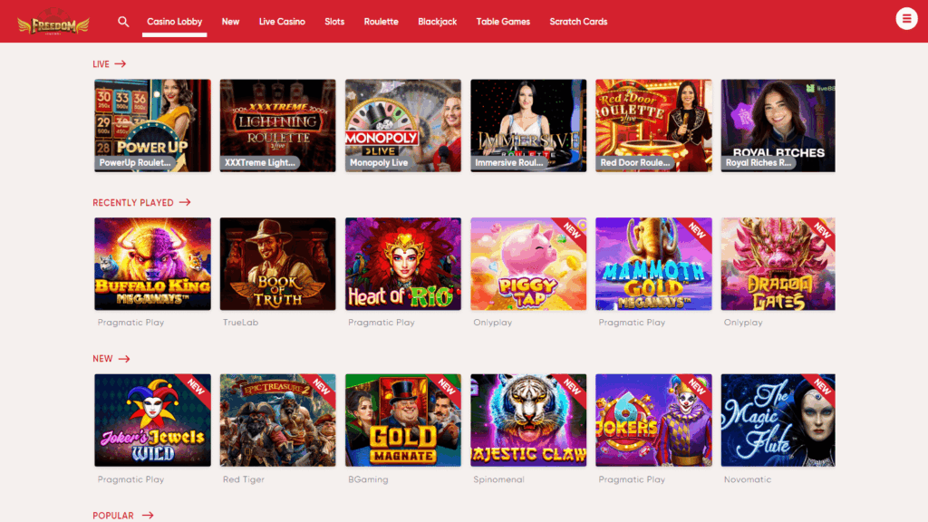Freedom – онлайн-казино, представленное новой платформой, ориентированной на небольшое количество стран, с широким выбором провайдеров и поддержкой популярных платежных методов, но с высокими рисками для игроков из-за недостаточно честных условий.