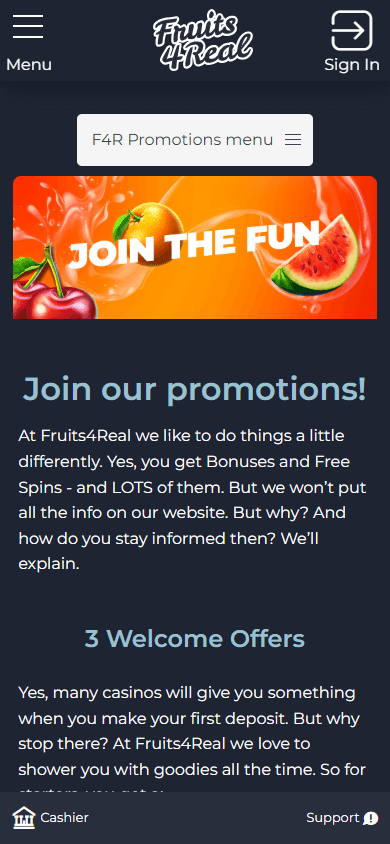 Fruits4Real Casino – онлайн-казино с лицензией Мальты, предлагающее широкий выбор игровых автоматов, настольных и живых игр, поддержку криптовалют и работает преимущественно с международной аудиторией. Сайт отличается большим количеством платёжных методов и хорошей работой службы поддержки, но имеет ряд ограничений и спорные правила, негативно влияющие на безопасность и доверие игроков.