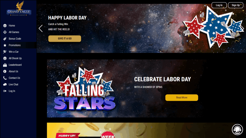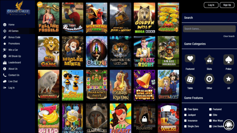 Платформа принадлежит TD Investments Ltd и действует по лицензии Kahnawake. Пользователю доступны слоты, рулетка, блэкджек, видео покер, бакара, а также несколько игр с джекпотом и live-столами. Grand Eagle Casino сотрудничает с шестью провайдерами игр, среди которых есть такие известные компании, как Evolution Gaming, Betsoft, Saucify и Rival, что обеспечивает разнообразие, но ограничивает ассортимент по сравнению с конкурентами. К сожалению, выбор слотов ограничен скромным числом студий, а набор live-игр и автоматов значительно уступает площадкам-лидерам.