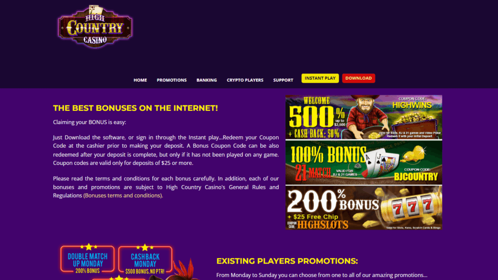 High Country Casino – онлайн-казино с акцентом на возможность оплаты криптовалютой и подборкой популярных прогрессивных джекпотов, предлагающее бонусы для новых и постоянных игроков, но работающее без лицензии и ограниченное по игровому ассортименту и лимитам выплат.