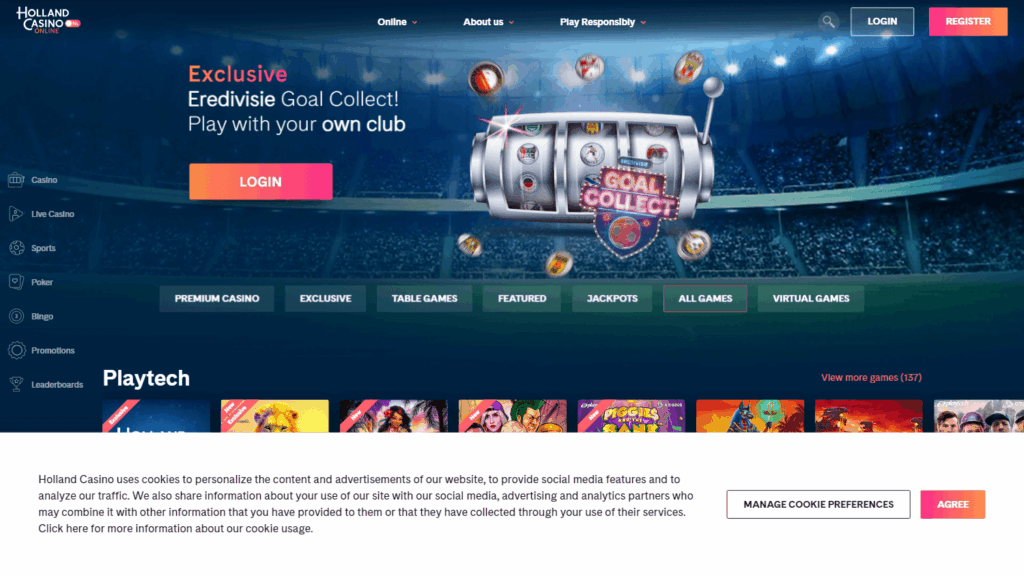 Ассортимент Holland Casino включает все востребованные виды игр: от слотов и настольных игр до live-казино и видео покера. Перечень провайдеров насчитывает 33 студии, среди которых NetEnt, Playtech, Play’n GO, Pragmatic Play, Yggdrasil Gaming, Betsoft и другие. Собственная площадка для покера предлагает стабильный софт и подходящую инфраструктуру для любителей этого направления.