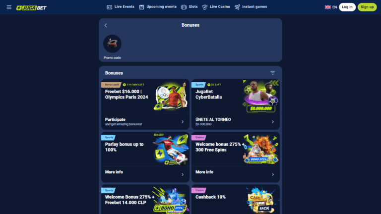 JugaBet – онлайн-казино и букмекер с лицензиями от Кюрасао и Анжуан, ориентированное на игроков из Чили. Платформа отличается широким выбором игровых провайдеров, возможностью спортивных ставок и поддержкой 24/7 через онлайн-чат.