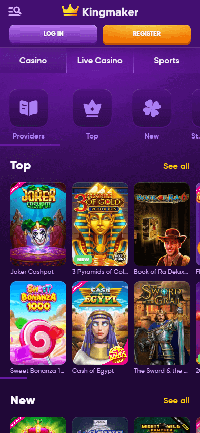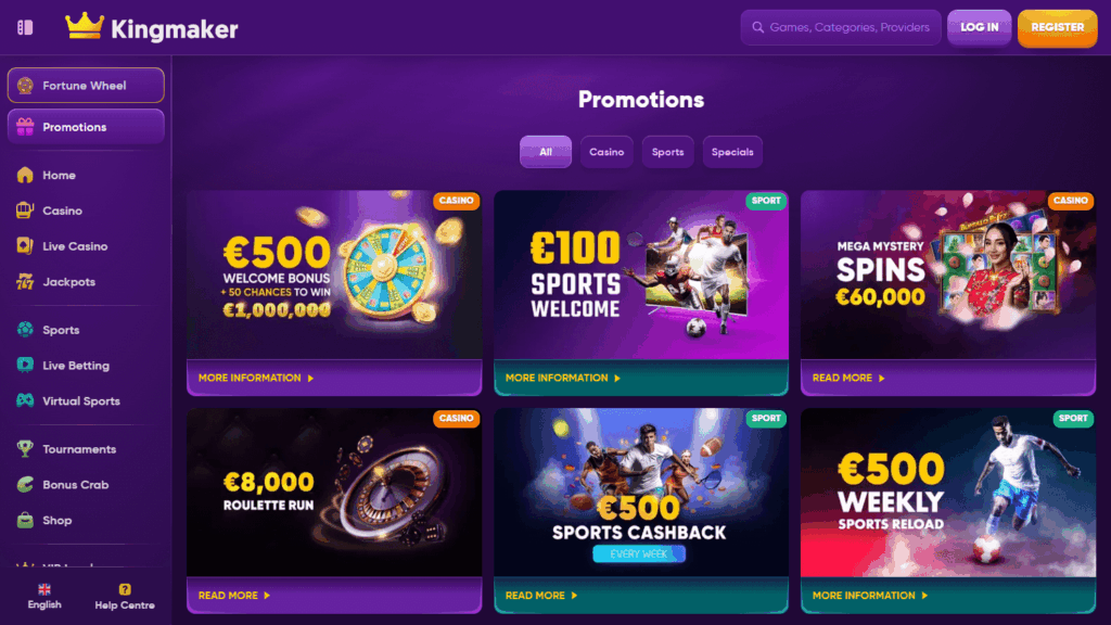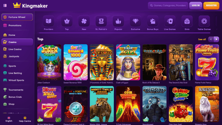 Kingmaker Casino – онлайн-казино со ставками на спорт, криптовалютными платежами, высокой степенью безопасности и внушительной коллекцией из более 6000 игр. Здесь предусмотрены бонусы для новых и постоянных пользователей, уникальные призовые предложения через собственный «магазин», а также множественные языковые и платежные опции.