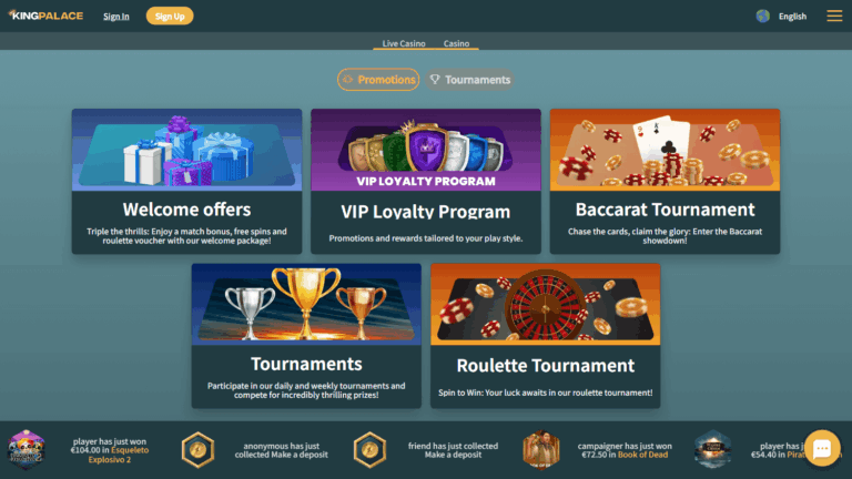 KingPalace подходит тем, кто ищет обширную коллекцию игр – здесь доступны слоты, столы, live-игры и быстрые игры от более чем 40 известных международных провайдеров, включая NetEnt, Evolution, Pragmatic Play, Microgaming и другие. Для любителей классических игр предусмотрено множество вариантов рулетки, блэкджека, бакара и покера, при этом фильтрация и поиск позволяют быстро находить нужные тайтлы. Особое внимание уделено прогрессивным джекпотам и играм с функцией бонус-бай, что может заинтересовать как новичков, так и опытных пользователей.