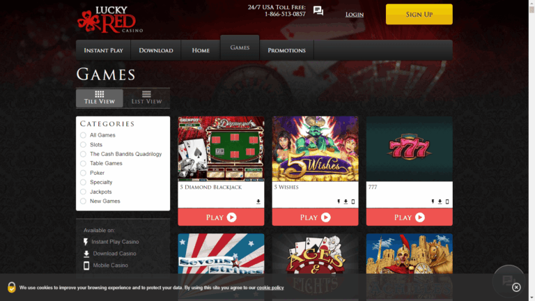 Ассортимент игр представлен только двумя разработчиками: Realtime Gaming и Visionary iGaming. Оператор предлагает слоты, рулетку, блэкджек, видеопокер, баккару, кено и джекпот-игры. Небольшое разнообразие провайдеров – ключевой минус для опытных игроков, привыкших к широкому выбору контента. В то же время качество и актуальность представленных игр поддерживаются на достойном уровне;