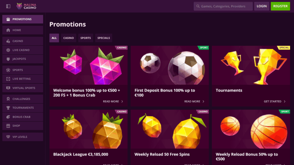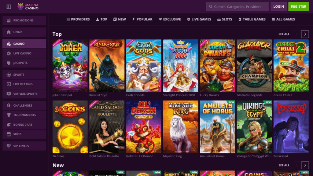 Malina Casino располагает внушительной коллекцией: более сотни провайдеров обеспечивают тысячи различных слотов, настольных и лайв-игр. Здесь легко найти актуальные хиты от NetEnt, Play’n GO, Pragmatic Play, Evolution, а также автоматы и live-шоу всех жанров. Для любителей ставок доступен отдельный раздел спортивного беттинга и виртуальных видов спорта.