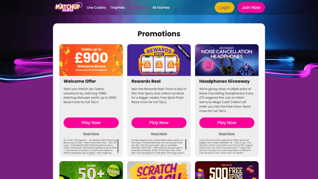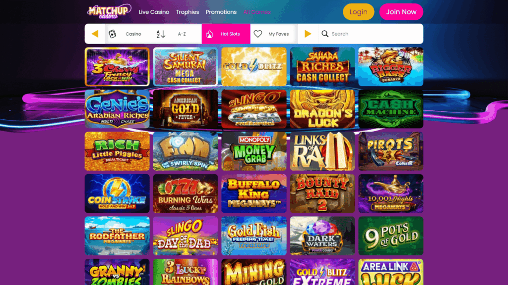 Среди основных достоинств Matchup – прозрачная правовая база и надежная репутация. Казино проходит регулярные проверки, не фигурирует в известных черных списках и избегает серьезных жалоб, связанных с невыплатой выигрышей. Большой пул связанных операторов только усиливает общую устойчивость бренда. В игровых категориях доступны слоты, карточные и настольные игры, живые столы, многочисленные розыгрыши бинго и скретч-карты. Игры представлены ведущими студиями, такими как NetEnt, Playtech, Evolution Gaming, Play’n GO, что гарантирует актуальность и качество контента.
