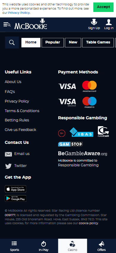 McBookie – онлайн-казино с акцентом на спортивные ставки и внушительным выбором игровых автоматов, настольных и live-игр, предназначенное исключительно для резидентов Великобритании. Компания работает по лицензии UK Gambling Commission и принадлежит Star Racing Limited, что гарантирует базовый уровень регулирования. Автоматизированные лимиты на снятие отсутствуют, а выбор слотов и провайдеров впечатляет по меркам небольшого оператора.