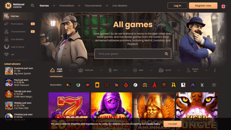 National Casino – онлайн-казино с широким выбором слотов, настольных игр, лайв-дилерами, программа лояльности и приложение для мобильных устройств. Основные черты платформы: внушительное количество провайдеров (более 100), крупная аудитория, расширенные финансовые лимиты и мгновенный доступ к ставкам.