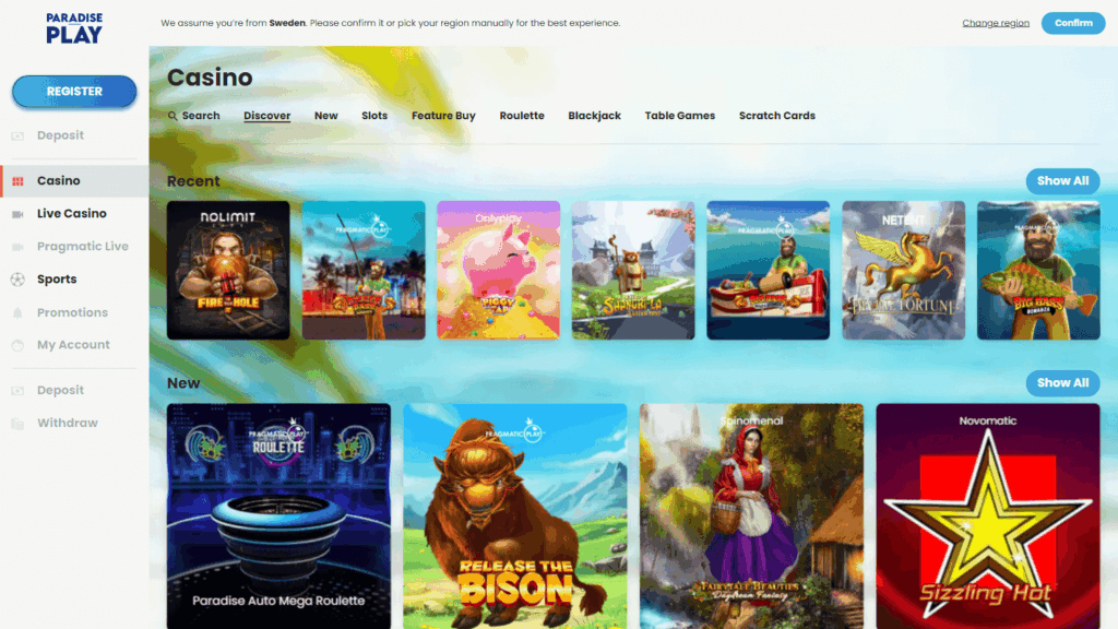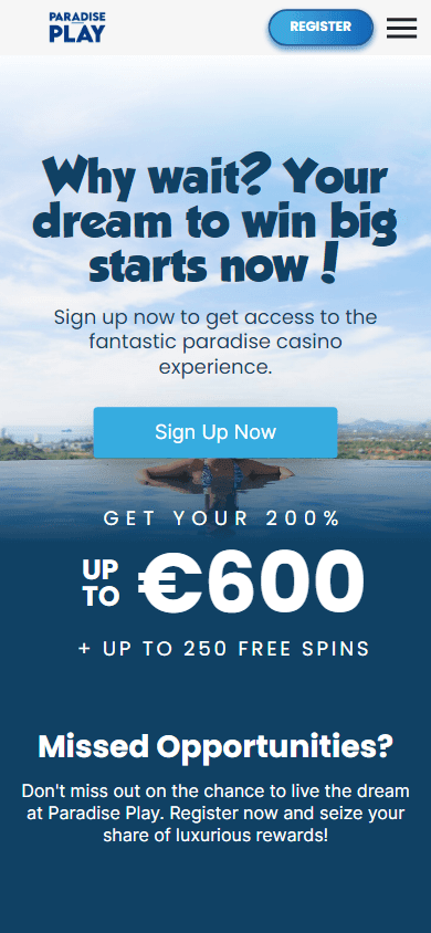 Paradise Play – онлайн-казино среднего размера с лицензией Tobique Gaming Commission, которому свойственна узкая география игроков, удобное многообразие игр и моментальный отклик службы поддержки, но при этом присутствует ряд существенных проблем с надежностью.