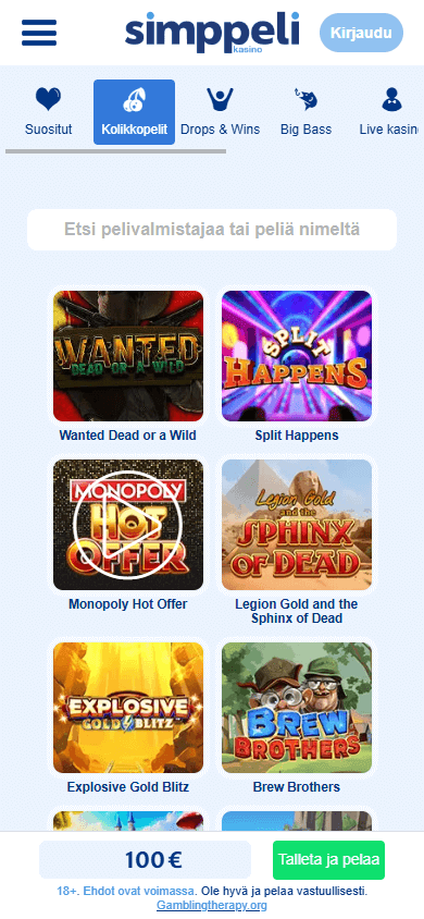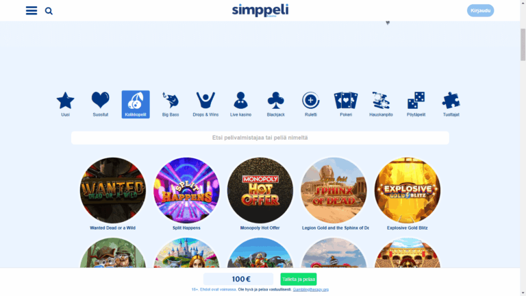 Simppeli предлагает библиотеку более чем из 4000 игр от 130+ студий, включая NetEnt, Play’n GO, Microgaming, Evolution, Pragmatic Play, ELK, Blueprint и других. Доступны не только слоты, но и рулетка, блэкджек, покер, кено, скретч-карты, краш-игры, лайв-столы, игры с джекпотами и шоу-игры с живыми дилерами. Все тайтлы сертифицированы, RTP игр публикуется открыто на сайте. Минимальный и максимальный диапазон ставок позволит подобрать оптимальные условия для любого стиля игры.