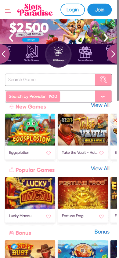 Slots Paradise – онлайн-казино небольшого международного формата с лицензией Anjouan Gaming (Коморы), известное достойной политикой по отношению к игрокам, современной подборкой слотов и значительным выбором способов пополнения счета, включая криптовалюты и распространённые банковские карты. Здесь представлены игры от 35 разработчиков, бонусные предложения и круглосуточная поддержка в чате.
