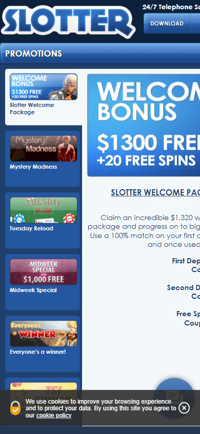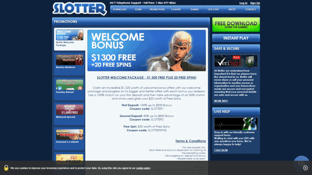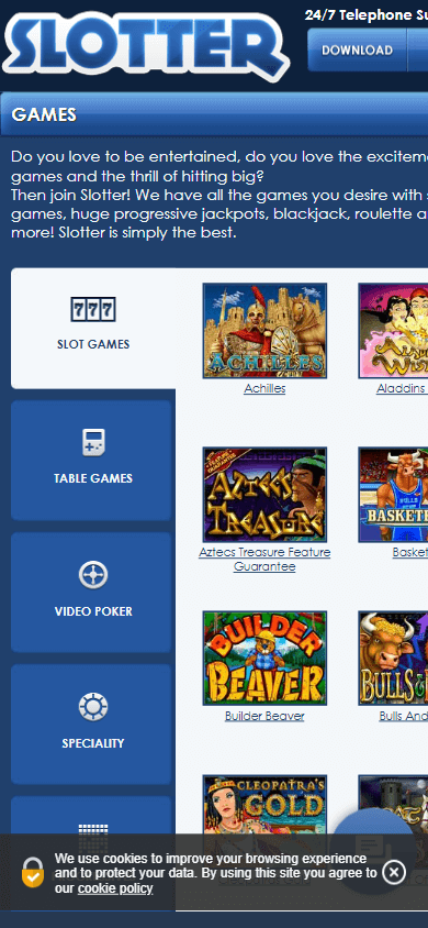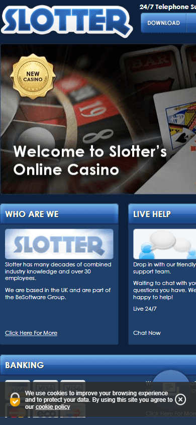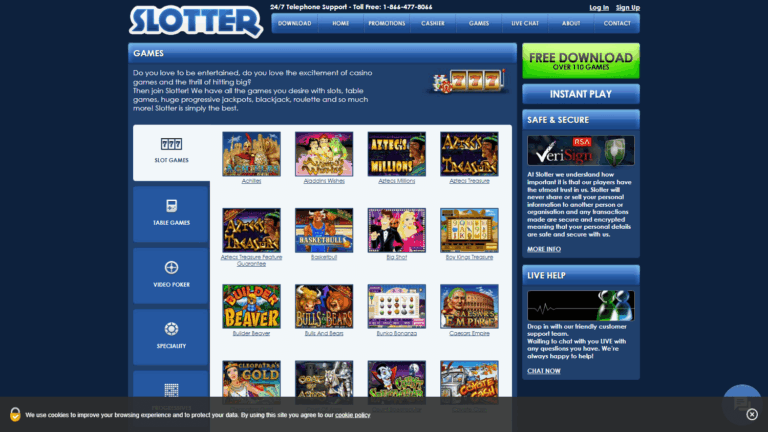Slotter – онлайн-казино, ориентированное на любителей слотов, настольных игр и видеопокера, функционирующее по лицензии Anjouan Gaming и принимающее только игроков старше 21 года. Основная платформа – Realtime Gaming; работает на ПК, мобильных устройствах через браузер и отдельное приложение. Казино обслуживает англоязычную аудиторию, поддерживает удобные режимы моментальной игры и загрузки, выделяется круглосуточной поддержкой на русском и английском через чат и телефон.