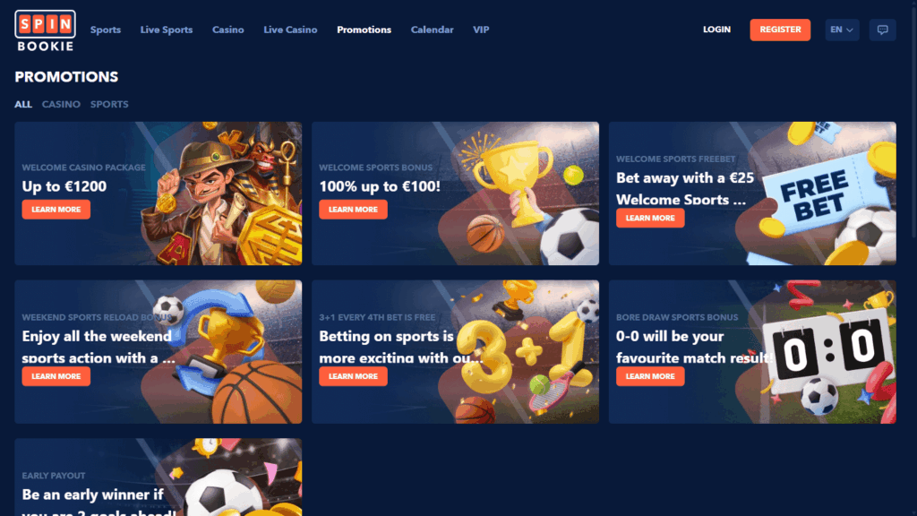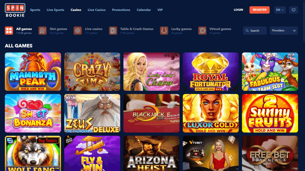 Spinbookie – международное онлайн-казино среднего размера, оперируемое Famagousta B.V. и лицензированное в Кюрасао и Kahnawake. Главная особенность платформы – внушительный выбор из более чем 2000 игр от 88 ведущих провайдеров, включая NetEnt, Microgaming, Evolution, Pragmatic Play и других. На сайте представлен большой выбор слотов, настольных игр, live-казино, а также ставки на спорт и киберспорт. Доступны депозиты и выплаты через криптовалюты, электронные кошельки, банковские карты и еще около 50 методов, что удобно для игроков из разных стран.