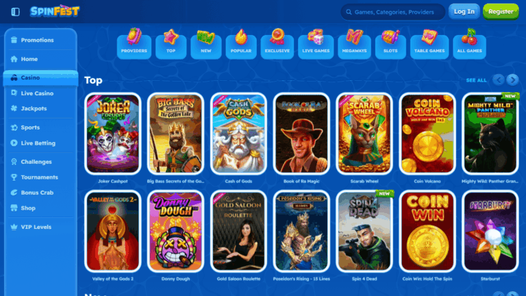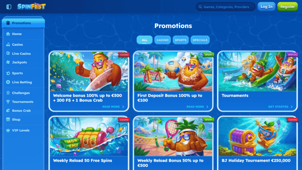Spinfest – онлайн-казино с международной лицензией, принимающее криптовалюту, предлагающее обширное портфолио игр и поддерживающее работу на мобильных устройствах. Ключевая особенность платформы – поддержка более нескольких десятков платежных методов, богатый выбор игровых провайдеров и круглосуточная поддержка на разных языках.