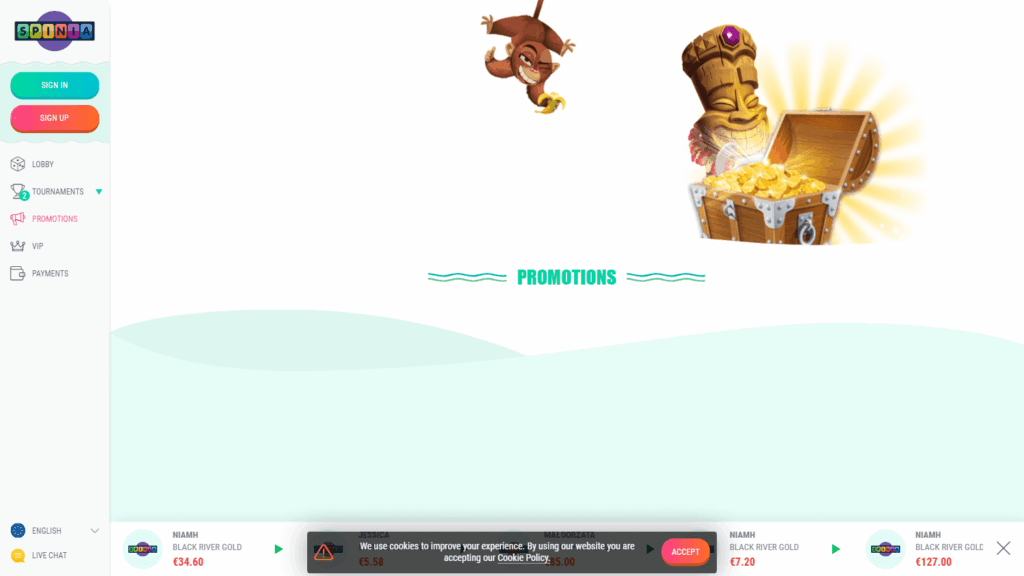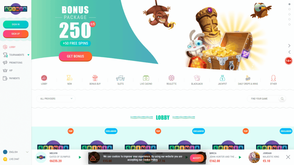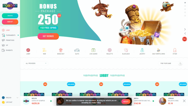 Игровой портфель Spinia охватывает более 2000 слотов, лайв-дилеров и карточных игр от ведущих поставщиков – NetEnt, Play’n GO, Pragmatic Play, Yggdrasil, Evolution и других. Сортировка по провайдерам облегчает поиск, а турнирные активности (гонки на слотах, турниры по столам) и регулярные акции с фриспинами добавляют игрокам мотивацию для постоянной активности. Программа лояльности рассчитана на любителей слотов, так как баллы начисляются только за игру на автоматах.
