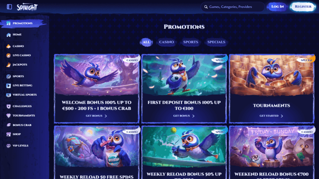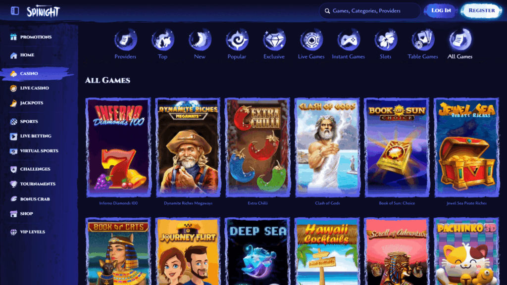 Клиентам Spinight предоставляется доступ к тысячам игр, включая слоты, настольные и live-игры, а также виртуальный спорт, краш-игры, бинго и раздел ставок на спорт. Казинo сотрудничает с более чем 200 провайдерами, среди которых есть NetEnt, Evolution, Pragmatic Play, Play’n GO, Microgaming, Red Tiger, Blueprint и другие ведущие студии. Игровое лобби отличается удобной фильтрацией и поиском, а новые и эксклюзивные релизы появляются регулярно.