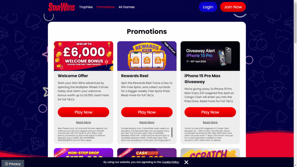 В Star Wins реализована собственная программа наград, связанная с выполнением игровых заданий и достижением новых уровней. Прогресс отмечается в системе лояльности, активных розыгрышах и призовых роздах для постоянных пользователей. Приветственный бонус доступен для новых участников, однако акционные предложения представлены довольно скромно по сравнению с крупными международными брендами.
