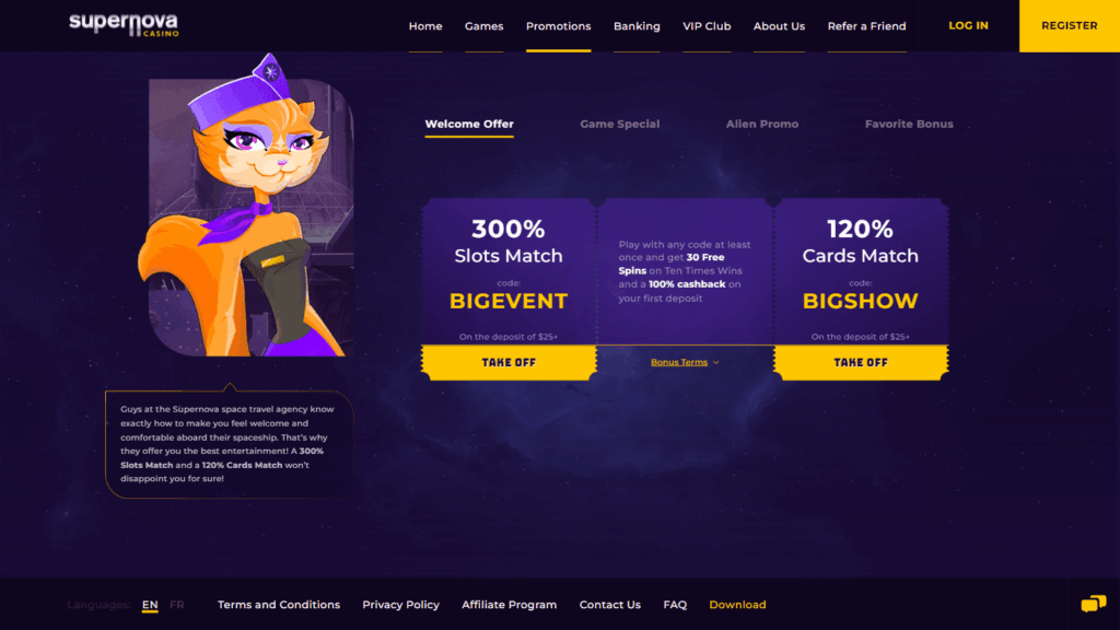Supernova Casino – онлайн-казино с обширной бонусной политикой для разных категорий игроков и заметным упором на прозрачность работы. Компанию отличает преимущественно честное отношение к пользователям, умеренные игровые ограничения и регулярные турниры.