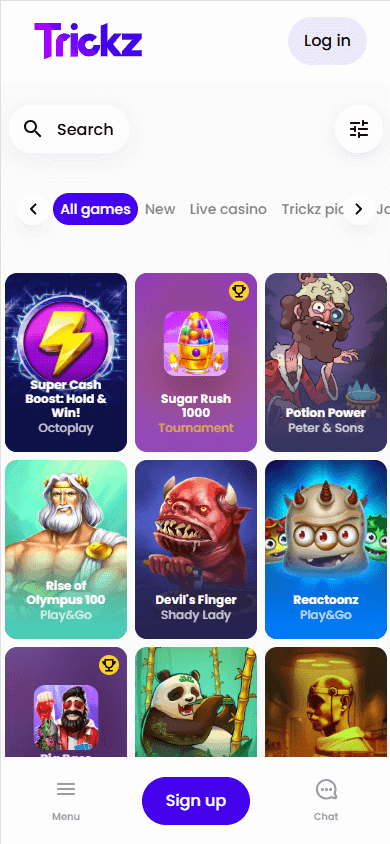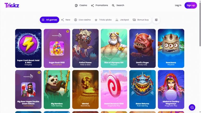 В каталоге Trickz Casino обширная библиотека: слоты, настольные игры, видео-покер, живой дилер, бинго, джекпоты, карточные и специальные игры от 47 разработчиков – NetEnt, Evolution, Yggdrasil, Novomatic, Play’n GO, Pragmatic Play, Blueprint и других. Зал устроен по принципу быстрого поиска: фильтруйте по провайдеру или используйте строку поиска. Живые игры транслируются круглосуточно, доступна коммуникация с дилером, выставлены минимальные и максимальные ставки для разных категорий пользователей.