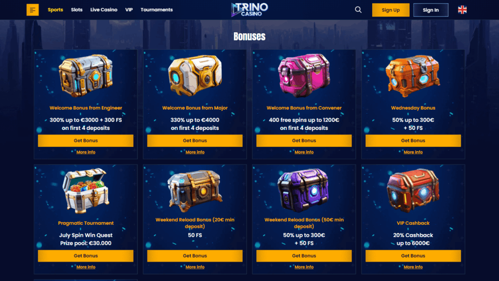 Trino – онлайн-казино среднего размера с международной аудиторией, которое отличается солидным уровнем безопасности, внушительным выбором игр от ведущих провайдеров и современной платежной инфраструктурой. Есть поддержка криптовалют, многофункциональный кассовый модуль, круглосуточная поддержка и кешбэк для лояльных клиентов.