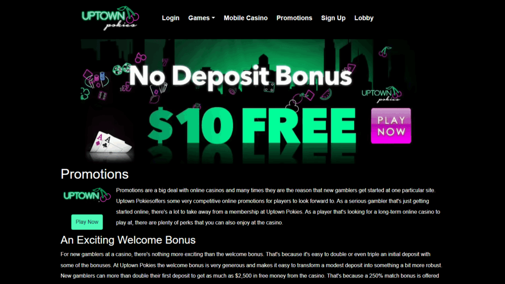 Uptown Pokies – онлайн-казино, ориентированное на игроков из Австралии, работающее под управлением Deckmedia N.V. и лицензией Кюрасао. Платформа отличается широким выбором бонусных предложений, поддержкой криптовалют и круглосуточной службой поддержки.
