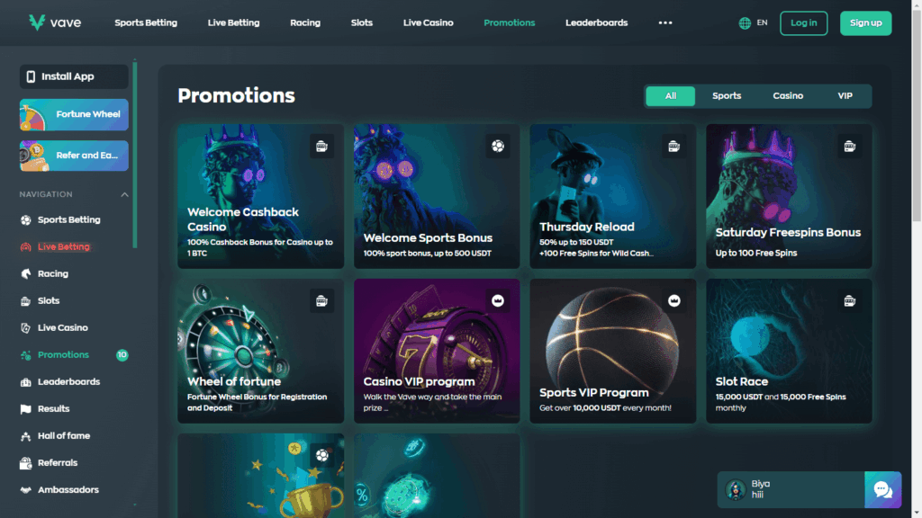 Комиссии на платежи Vave не взимает, операции совершаются в большинстве случаев быстро, но по некоторым способам возможна задержка до 72 часов. В плане ответственного гемблинга платформе есть куда развиваться: доступны самоисключение и ввод лимитов, но информационная база и инструменты самоконтроля ограничены по сравнению с лучшими представителями отрасли. Акции и бонусы представлены, есть кэшбэк до 1 BTC, новые предложения актуализируются регулярно.