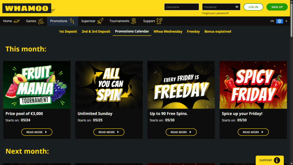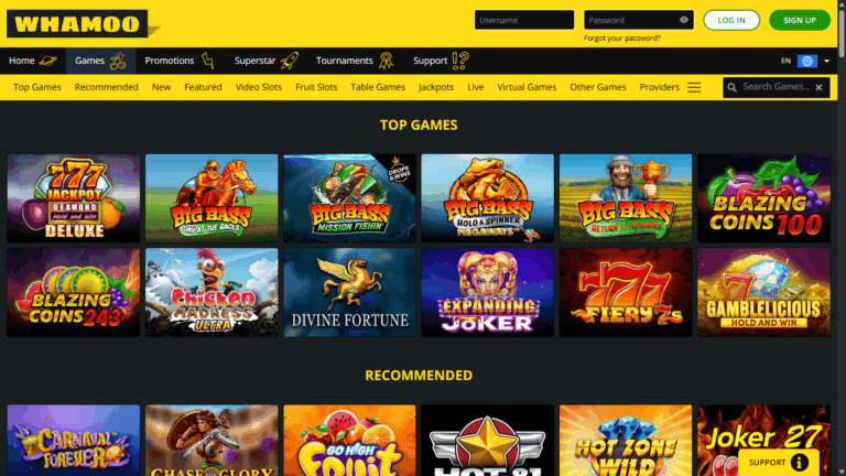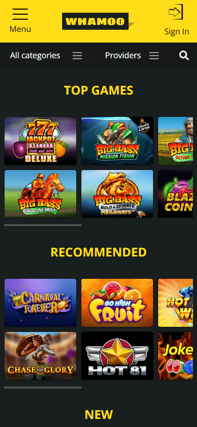 Whamoo ориентируется на любителей многообразия: в лобби представлено несколько тысяч игр от крупных и нишевых разработчиков, включая NetEnt, Play’n GO, Pragmatic Play, Yggdrasil, Red Tiger, Betsoft, Playson, Amatic, Ezugi, Thunderkick и других. Доступны слоты, видеопокер, настольные игры, бинго, краш-игры, live-шоу, а также столы с живыми крупье. Быстрый поиск и сортировка провайдеров помогают не тратить время на навигацию. Популярные игровые автоматы – Gonzo’s Quest, Starburst, Wolf Gold, Hotline 2. Для любителей настольных и live-игр предлагают множество рулеток, блэкджека, покера и баккары с разными лимитами ставок. Присутствует программа лояльности и несколько бонусных предложений для новичков и постоянных игроков.