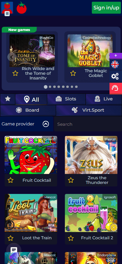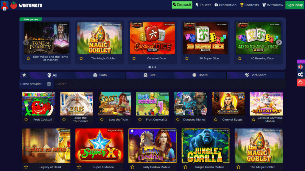 Игровое портфолио Wintomato состоит более чем из 60 известных провайдеров, включая NetEnt, Pragmatic Play, Play’n GO, Evolution Gaming и Playson. В ассортименте представлены слоты, настольные и карточные игры, видеопокер, бинго, кено, live-казино, быстрые игры, киберспорт и эксклюзивные лайв-шоу. Для упрощения поиска клиент может сортировать игры по провайдерам или пользоваться поиском, а понравившиеся варианты добавлять в избранное.