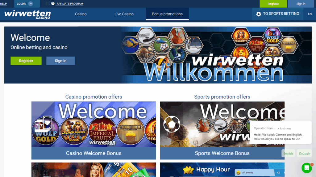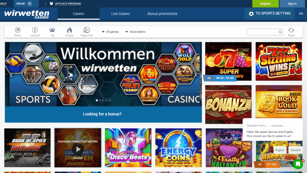 Wir Wetten – онлайн-казино и букмекер, известный широким выбором игр, ставками на спорт, мобильной адаптацией и поддержкой множества языков, сочетая функции для любителей слотов и спортивных ставок.