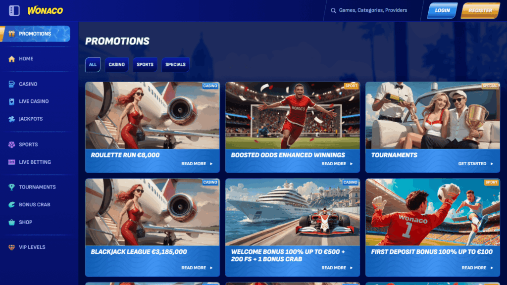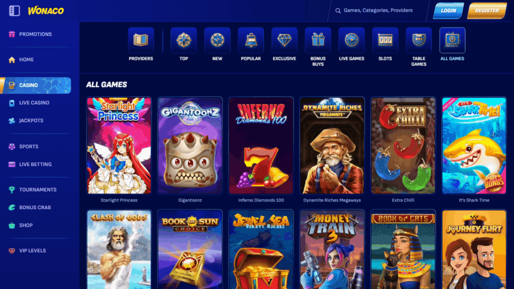 Wonaco – онлайн-казино с внушительным ассортиментом слотов, настольных и live-игр, поддержкой криптовалют и бонусной программой. Основные отличия: современный дизайн, удобная система лояльности с внутренним магазином бонусов и отдельный раздел ставок на спорт.