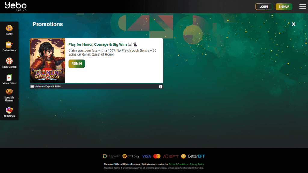 Если ваш приоритет – быстрая поддержка и простая регистрация с минимальными барьерами, Yebo заслуживает внимания. Проект пользуется популярностью среди игроков из Южной Африки благодаря прозрачным платежам в ZAR, поддержке телефонных звонков и круглосуточному сервису. Bitcoin и другие современные способы пополнения баланса позволяют легко проводить транзакции, а наличие программы лояльности помогает чувствовать постоянное внимание к активным клиентам. Бонусная система лояльна: здесь регулярно появляются новые предложения для зарегистрированных пользователей.