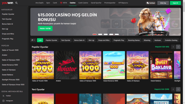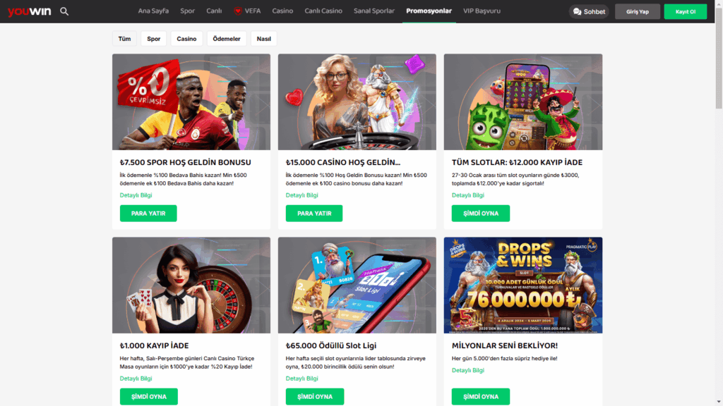 Youwin выделяется как крупная платформа, ориентированная исключительно на жителей Турции. Оператор предлагает более 2000 игр от ведущих мировых провайдеров, включая NetEnt, Novomatic, Microgaming и Evolution. Здесь легко найти как классические автоматы, так и live-игры с реальными дилерами, а также ставки на спорт, виртуальные виды спорта и разнообразные карточные развлечения.