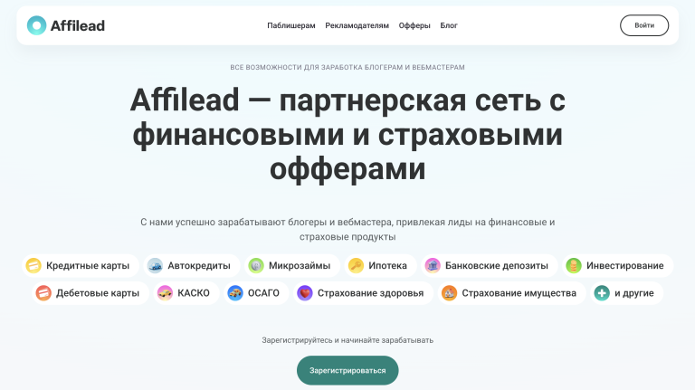 Affilead предлагает топовые и эксклюзивные офферы от крупнейших финансовых и страховых брендов: банки, МФО, страховые компании. Сеть работает с крупнейшими страховыми компаниями России — Ингосстрах, СОГАЗ, СК ПАРИ и ОСАГО. Партнеры получают доступ к уникальным условиям и повышенным ставкам, недоступным в других CPA-сетях.