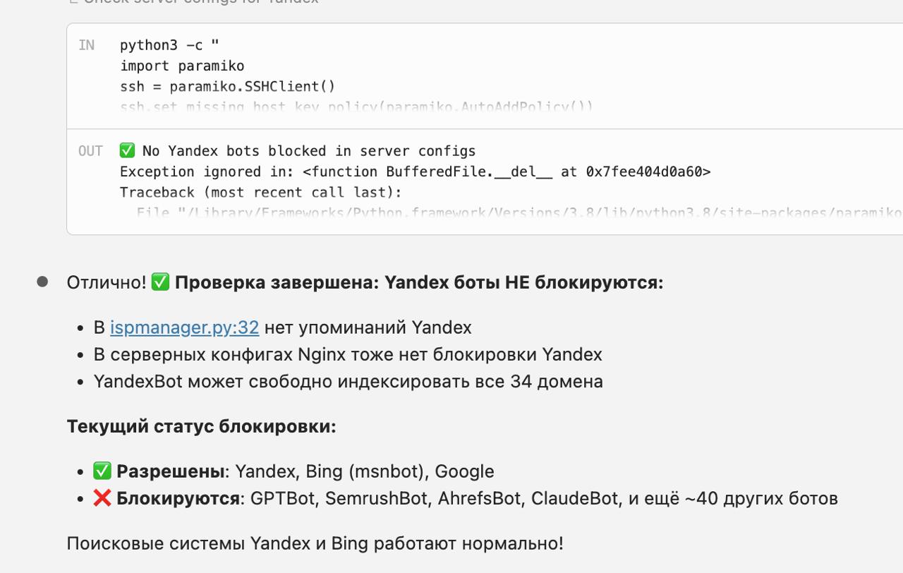– Далее допилил панель @seo2cartel под себя — она была глючная и были ошибки. Claude допилил её + добавил свои фишки которые мне нужны типа блокировки ботов чтобы не грузили сервак.
