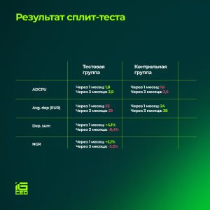 Если говорить в целом — гипотеза подтвердилась: мы действительно видим прирост по количеству депозитов на 1 игрока. И на короткой дистанции — тестовая группа была впереди и по сумме депозитов.