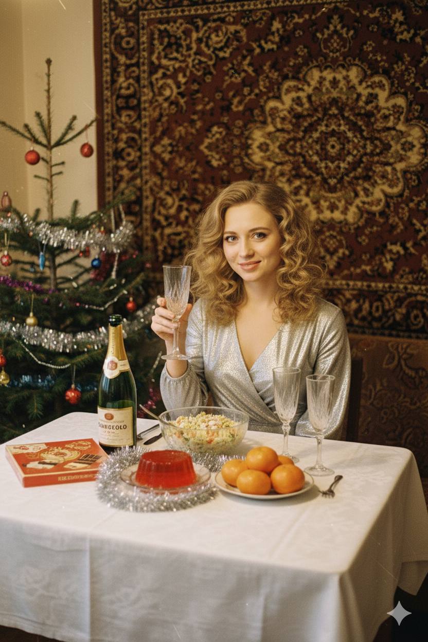 Use the uploaded selfie for the face. Identity lock 1:1 — keep exact facial geometry, expression, and skin tone. Preserve hair exactly as soft, voluminous 1980s blond curls with a side part. Ultra-photorealistic 1985 Soviet New Year’s Eve home scene. Woman sits at a rectangular table in a small living room, camera strictly at eye level — as if the viewer is across from her. Behind: full brown-and-beige woven Persian carpet on the wall, right side low brown sofa, left side small real fir tree with thin uneven branches, silver rain, glass garlands, a few red ornaments, softly blurred. Outfit: silver lamé V-neck dress reflecting warm yellow lamp light. On the table: white tablecloth with creases, crystal bowl with Olivier salad, authentic Soviet box of chocolates in vintage paper packaging, bottle of “Советское шампанское” with visible Cyrillic label, glass dish with red jelly, plate with peeled tangerines, two tall cut-glass champagne glasses (one half-filled), scattered silver tinsel, metal cutlery. Lighting: single warm tungsten lamp (~2700 K), soft golden glow, light shadows, fine film grain, no harsh contrast. Mood: calm, nostalgic, real. Apply old Soviet film photo effect — soft blur, slight focus falloff, white dust particles, faint scratches, mild yellow tint, low contrast, and natural fade for genuine 1980s printed-photo look. 4:5 aspect ratio, shallow depth of field, focus on face.