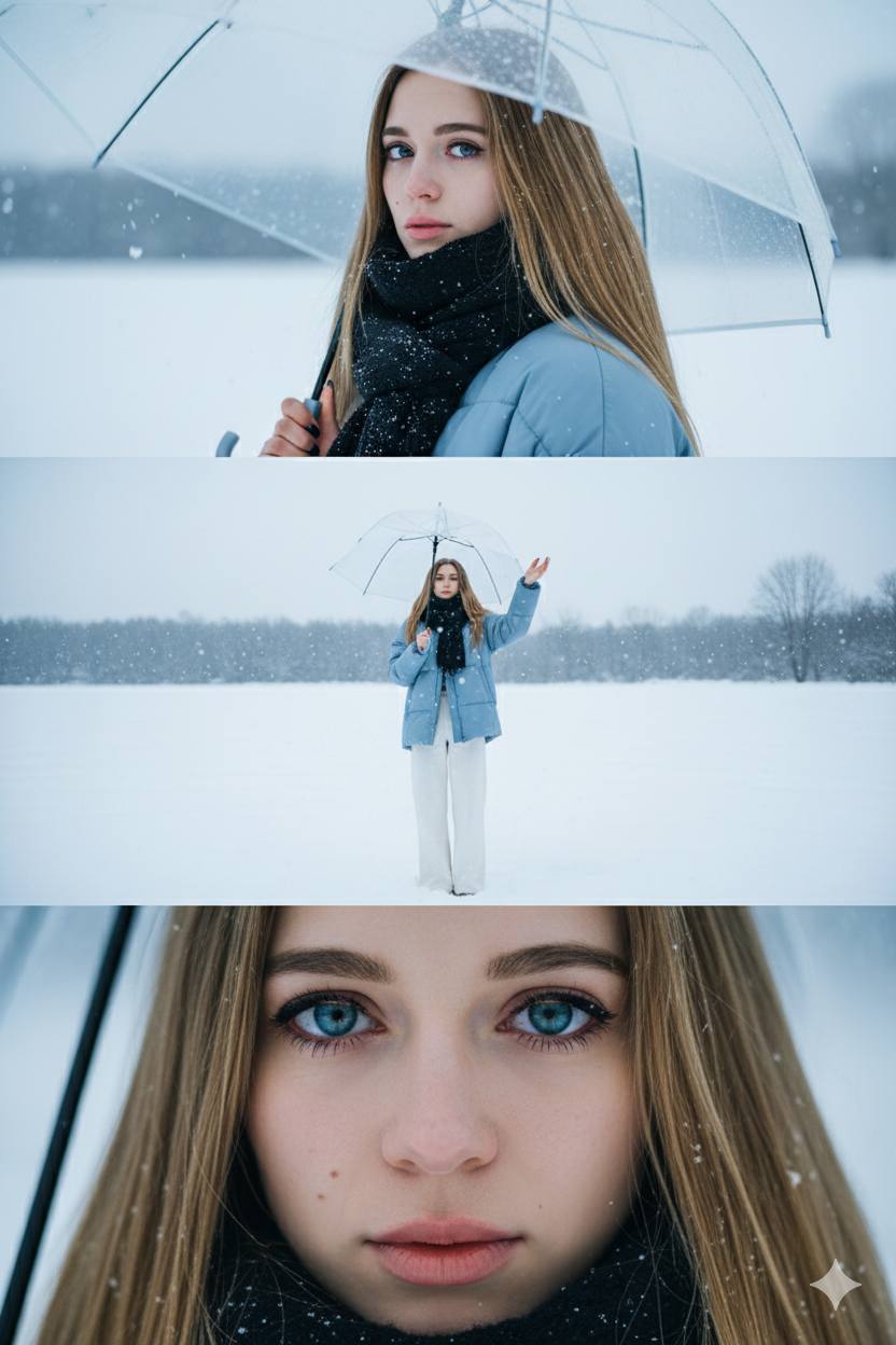 Use the same person from the uploaded photo — keep identical face shape, skin tone, eye color, hair color, and hairstyle. Create a vertical 4K frame divided into three equal horizontal scenes. The person fully matches the reference — only clothes and environment change. Mood: sadness, nostalgia, quiet loneliness. Outfit: loose winter puffer, wide-leg pants, black scarf. Colors: cold, snowy, white-blue tones. Portrait: holding a transparent umbrella, head slightly turned back, sad eyes looking at the viewer through falling snow. Full body: standing alone in a snowy field, umbrella in hand, looking up, one arm raised toward snowflakes, bare trees in the distance. Close-up: extreme zoom on the eyes — very close, sharp focus on pupils and reflections, deep gaze filled with sorrow and longing. Style: ultra-realistic, cinematic, detailed snow, soft lighting, natural proportions.