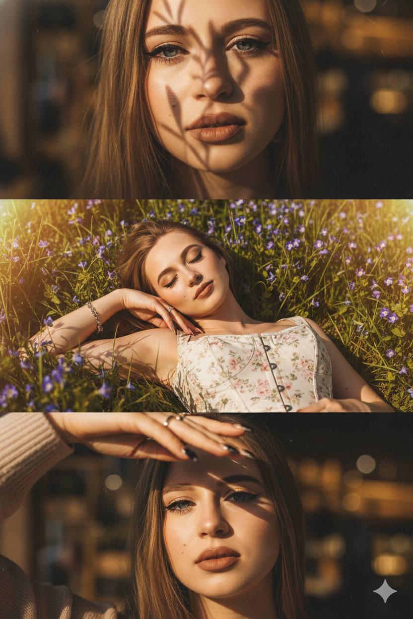 Новый визуальный тренд — триптихи. Одно вертикальное фото делится на три сцены: взгляд, движение, эмоция. Смотрится как кадры из фильма, идеально подходит для Pinterest, Reels и постеров.