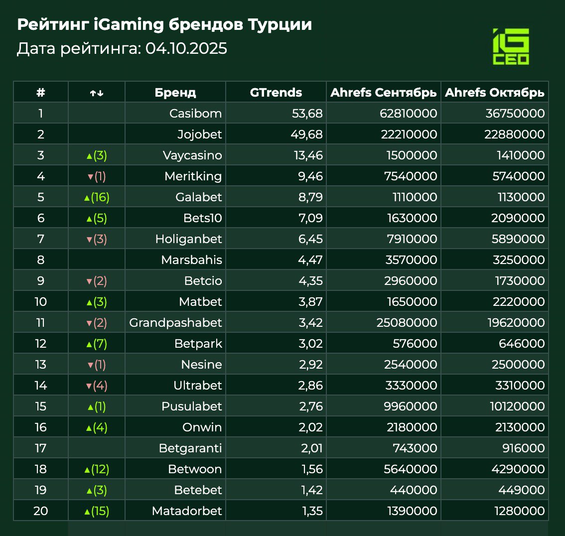 Лидерами топ-20 брендов по прежнему являются Casibom, Jojobet, однако третье место занял Vaycasino, поднявшись на три позиции, а Meritking опустился на 1 строчку.