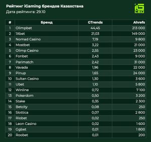 Обзор топ-20 iGaming брендов Казахстана за октябрь, новости о легализации онлайн-казино и борьбе с нелегальными ресурсами.