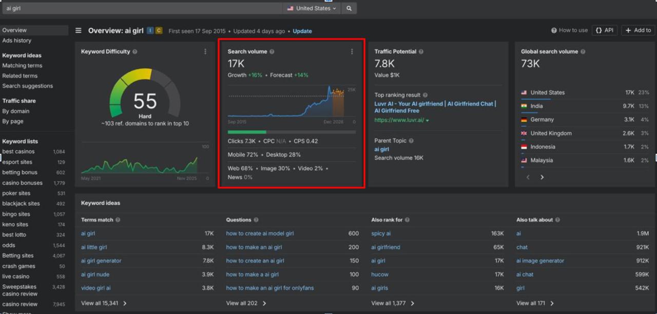 Возвращаясь к AI компаньонам. Я опять залез в Ahrefs, вбил ключ «ai girl»: https://prnt.sc/3Vlotoz-1m0_